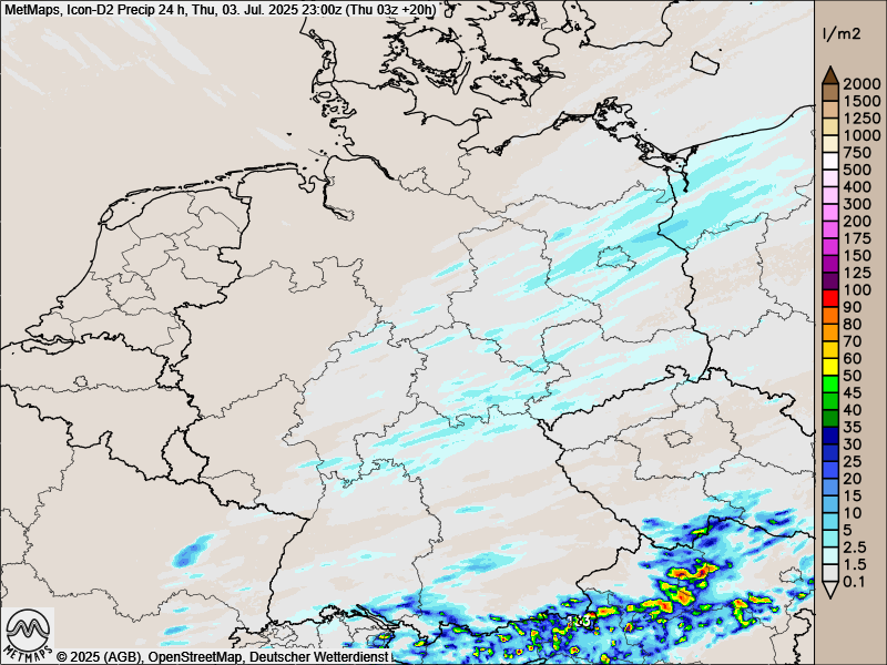 Bei Verdunstungsraten von zuletzt teils sieben bis acht Litern Wasser pro Tag und Quadratmeter, fallen die paar Tropfen Regenwasser am Donnerstag kaum ins Gewicht, in den meisten Regionen bleibt es heute sogar komplett niederschlagsfrei. Die höchsten Regensummen fallen am Donnerstag auf einer Linie vom Allgäu bis ins Berchtesgadener Land.