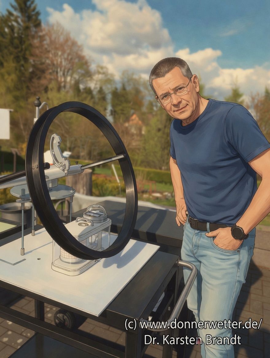 Auf dem Bild ist der sogenannte Schattenring gut zu erkennen: Er wirft gezielt einen Schatten auf den Sensor beziehungsweise die schwarze Metalloberfläche und blockiert damit die direkte Sonneneinstrahlung. Das Gerät misst dadurch ausschließlich die diffuse Himmelsstrahlung – also das Streulicht aus dem gesamten Himmel.