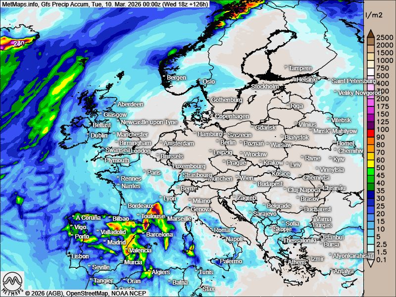 Deutlich anders präsentiert sich die Wetterlage im Südwesten Europas: Über Spanien und Südfrankreich ist in den kommenden Tagen mit teils heftigen Regenfällen zu rechnen. Dort können lokal große Niederschlagsmengen innerhalb kurzer Zeit fallen.