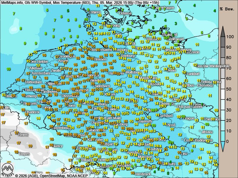 Die akkumulierten Regenmengen in Europa bis kommenden Dienstag sowie die Wetter- / Temperaturkarte für Donnerstagnachmittag (15:00 Uhr) nach GFS: